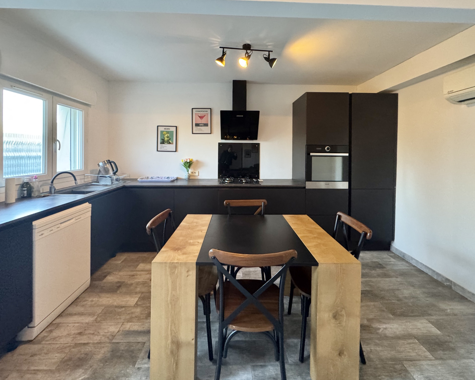 Le rez-de-chaussée propose une lumineuse pièce de vie avec une cuisine moderne aménagée et équipée. Vous y trouverez également une pièce pouvant faire office de salon, de bureau ou de chambre selon vos besoins, ainsi qu’une buanderie et un WC indépendant.